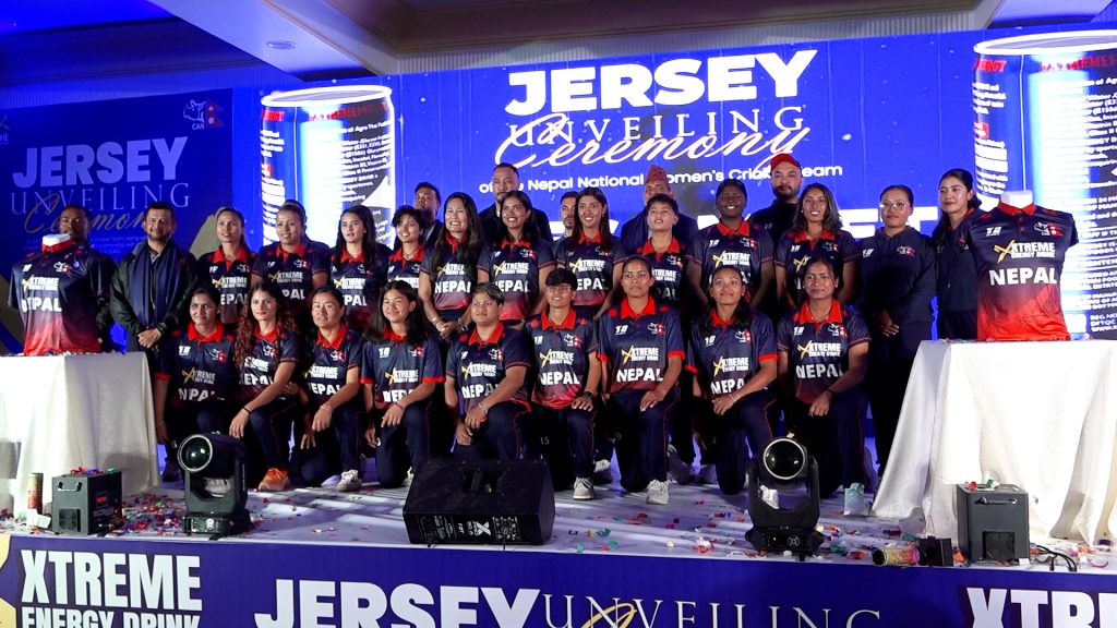 काठमाडौं । नेपाली महिला क्रिकेट टोलीको नयाँ जर्सी सार्वजनिक गरिएको छ । क्रिकेट संघ नेपालसँगको सहकार्यमा एक्सट्रिम इनर्जी ड्रिङ्कले आयोजना गरेको विशेष कार्यक्रममा बुधबार नेपाली राष्ट्रिय महिला क्रिकेट टोलीको जर्सी अनावरण गरिएको हो ।
